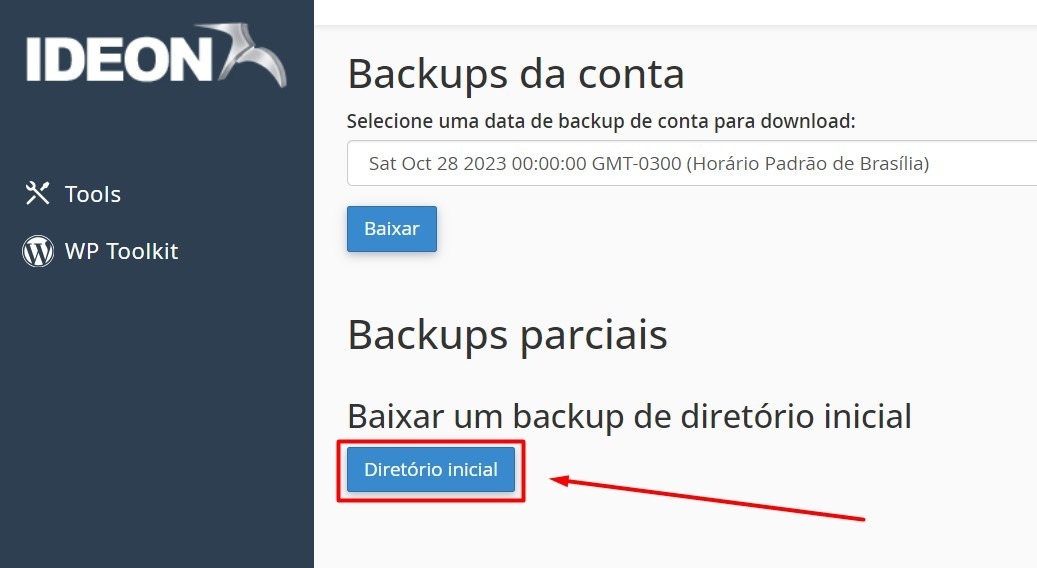 Na tela inicial do Backup, vá na opção BACKUPS PARCIAIS e na área Diretório Inicial clique no botão para baixar o arquivo de backup.