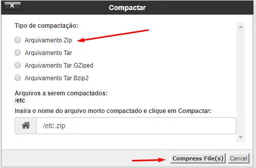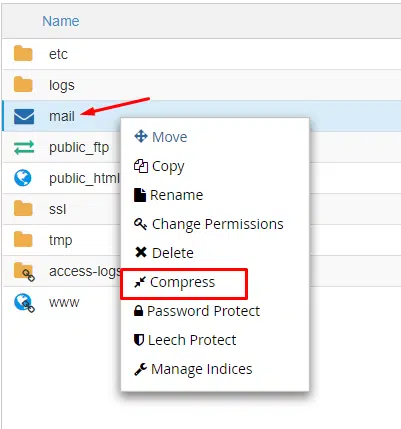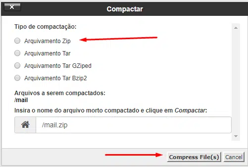 Faça os mesmos passos para compactar os arquivos do diretório mail. Basta seguir os passos mostrados nas imagens abaixo para saber como fazer backup dos e-mails do seu painel de controle cPanel.