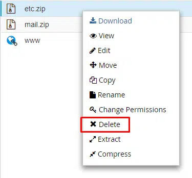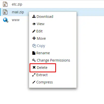Clique com o botão direito no arquivo etc.zip e selecione Delete para removê-lo. Faça exatamente a mesma coisa com o arquivo mail.zip, conforme mostram as imagens abaixo.