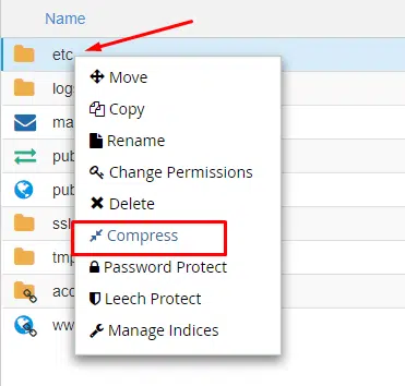 Clique com o botão direito no diretório etc e selecione Compress.