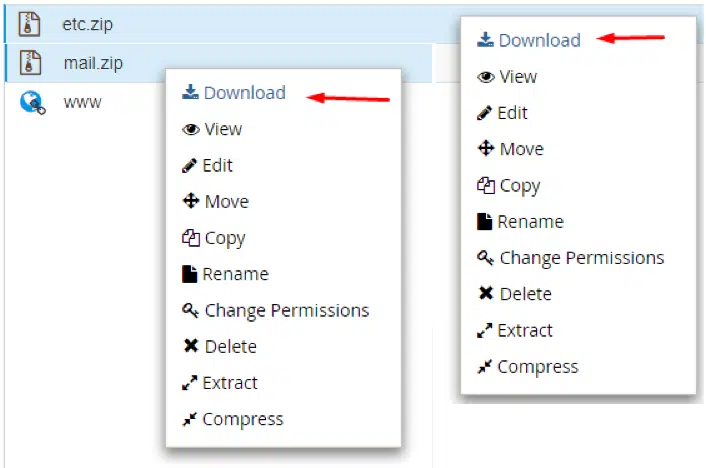 Clique com o botão direito no arquivo etc.zip e selecione Download. Faça mesma coisa com o arquivo mail.zip. Seus arquivos dos dois diretórios, então, serão baixados para o seu computador.