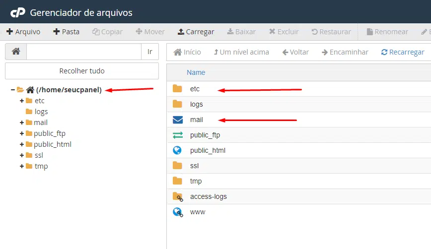 Dentro do Gerenciador de Arquivos, certifique-se de que você está no diretório home da sua conta de hospedagem. Ele geralmente está no formato /home/nomedeusuario. Nele, você vai ver dois diretórios: etc e mail.