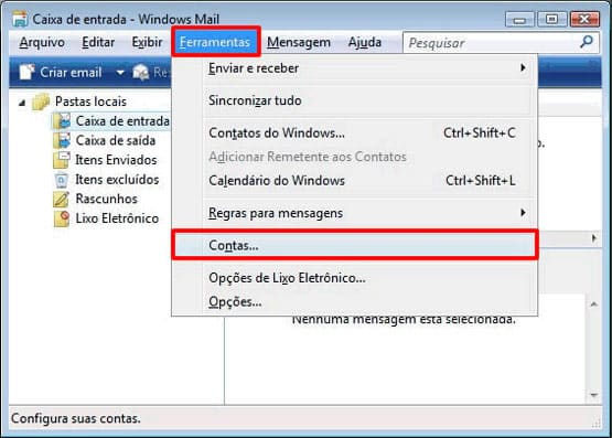 Abra o Windows Mail, clique na opção “Ferramentas”, depois em “Contas”.