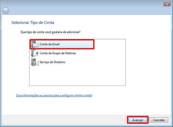 O assistente de configuração do Windows Mail será iniciado. Em Tipo de Conta selecione a opção “Conta de Email” e, depois, clique em “Avançar”.