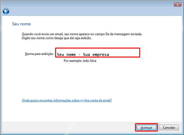No campo Nome para exibição, informe o nome que irá aparecer para quem receber seu e-mail. E clique em “Avançar”.