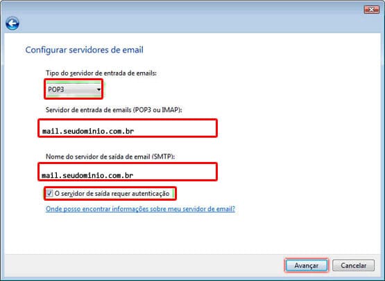 Servidor de entrada de e-mails (POP3, IMAP) digite mail.seudominio.com.br
