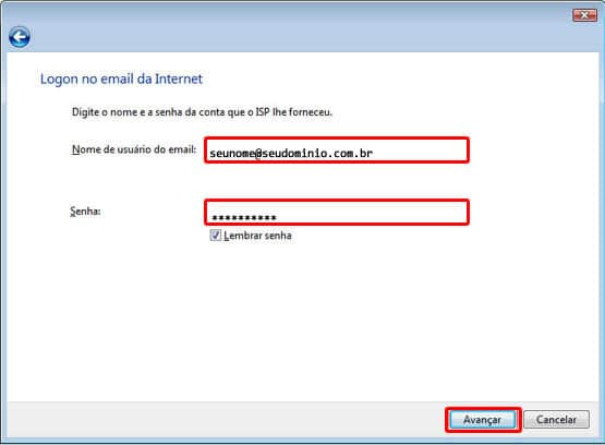 No campo Nome de usuário do e-mail, informe o e-mail completo e no campo Senha, digite a senha do e-mail. E clique em “Avançar”.
