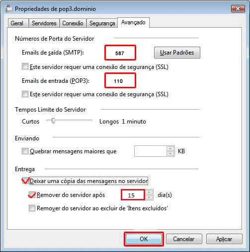 Clique na guia Avançado. em Emails de saída (SMTP), altere a porta para 587 e clique no botão “Ok”.